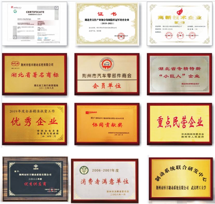 公司于2006年10月通过ISO9001-2000质量管理体系认证,2010年9月通过ISO/TS16949-2009质管管理体系认证2018年8月通过IATF16949:2017质量管理体系认证。2018年获得“高新技术企业”称号。 2019年获得“湖北省支柱产业细分领域隐形冠军”。2021年公司与武汉理工大学联合成立了“制动系统联合研发中心”。2021年被认定为省级专精特新“小巨人”企业。